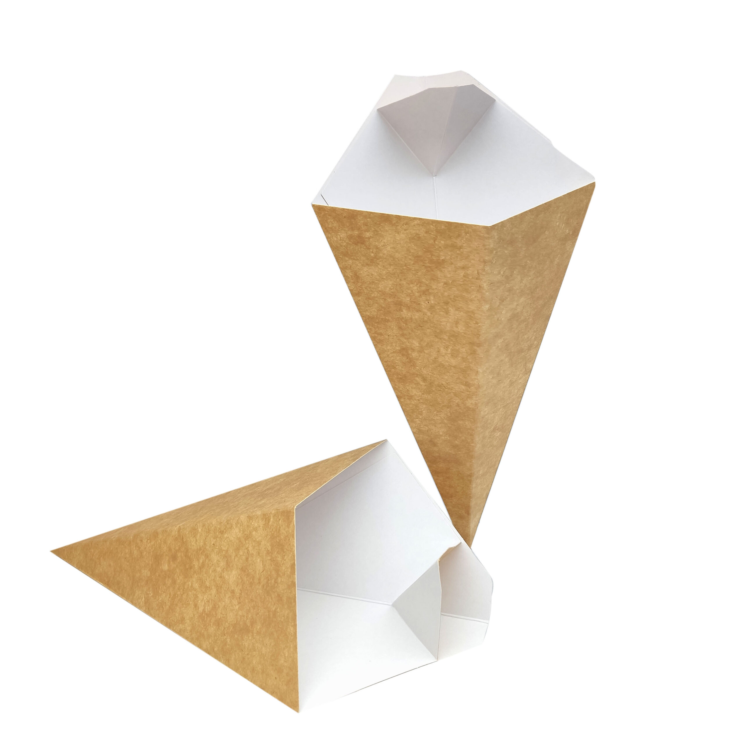 Самый популярный вариант упаковки для снеков – это конверт — конус из картона. Конверт ламинированный внутри поставляется в склеенном виде , готов к использованию. Плотный картон не размокает и не мнется. Он также предотвращает возможность получить ожоги. Это особенно важно, если речь идет о детях. Такой конверт удобно держать в руках, так что можно кушать любимое блюдо «на ходу».